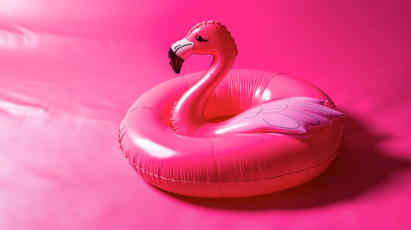 A pink flamingo-shaped pool float resting on a bright pink background, perfect for summer fun.