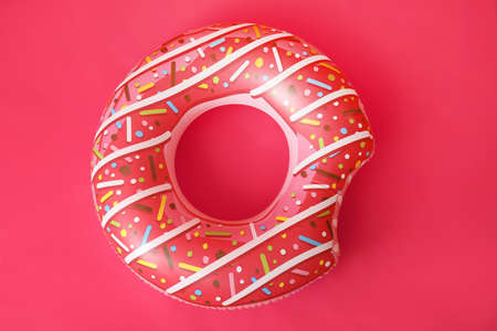 pink inflatable donut donut floating mattress in swimming pool. Beach pool accessories. Summer holiday concept.