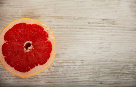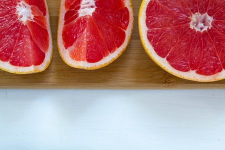 Closeup of raw and organic grapefruit pieces on a kitchen wooden table. top view.