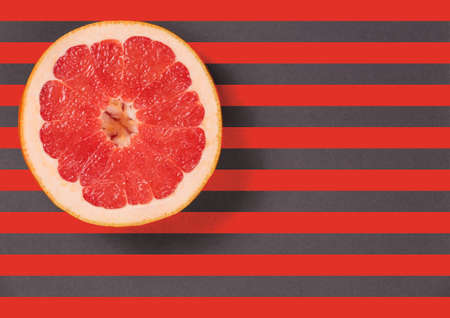 Red juicy grapefruit on a striped background top view. Striped background in red and gray stripes. Red grapefruit located top left. Lines texture. Diagonal lines.