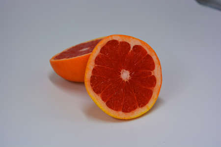 Two halves of a ripe juicy grapefruit, divided into two identical halves, located on a white background. Delicious and healthy sweet and sour fruits for the human body and health.