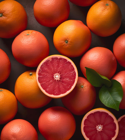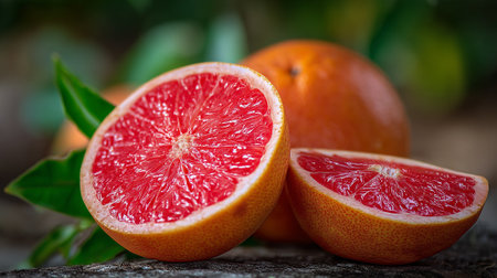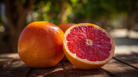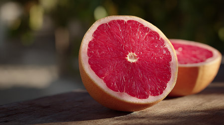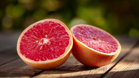 Juicy grapefruit halves on weathered wood surface, vibrant color, summer food theme
