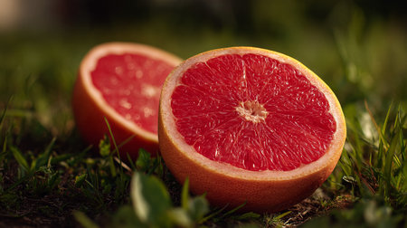 Freshly cut grapefruit halves sitting outdoors on the lush green grass