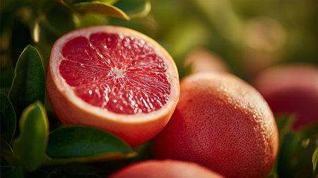 Fresh Cut Ruby Red Grapefruit With Green Leaves in Soft Light