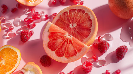 Fresh citrus and berries displayed on a vibrant pink background, ideal for healthy eating and vibrant themes.