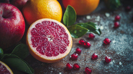 Close-up of a halved red grapefruit and scattered pomegranate seeds on a dark, rustic surface, creating a moody, vibrant setting that emphasizes texture and color.