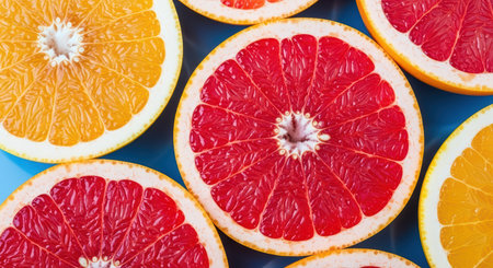 Close-up of a fresh cut grapefruit on a blue surface