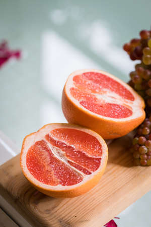 cut grapefruit on a wooden Board, citrus on wooden background