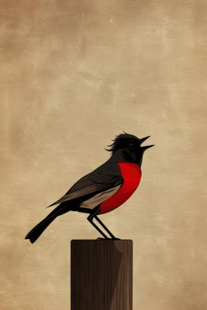 vibrant red and black songbird perches on a wooden post against a soft beige background. The minimalist design emphasizes the birds striking colors and unique silhouette.