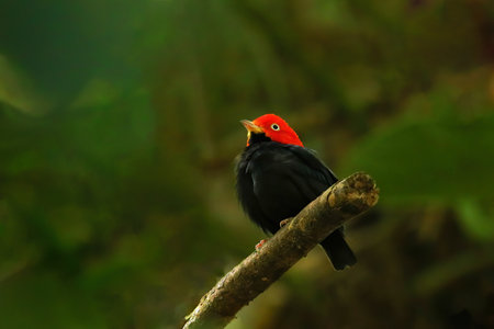 Red-capped manakin (Ceratopipra mentalis) sitting on a branch, Costa Rica