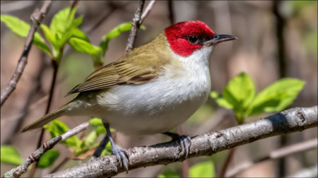 A close-up shot of a small bird with a distinctive red head and white chest, perched on a tree branch surrounded by green leaves.