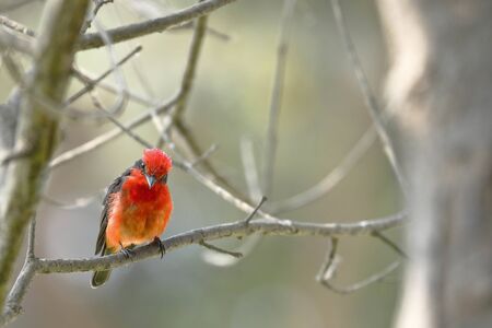 Vermilion flycatcher (Pyrocephalus rubinus) male perched still on branches