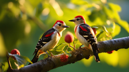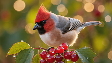 A charming common redstart perched on a branch with ripe berries in a beautiful garden setting during golden hour