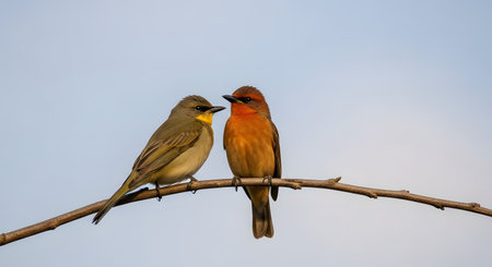 Two small, colorful birds with orange and olive plumage are perched together on a bare tree branch against a clear blue sky. The pair sits close to one another, showcasing their vibrant feathers and delicate features in a natural setting.