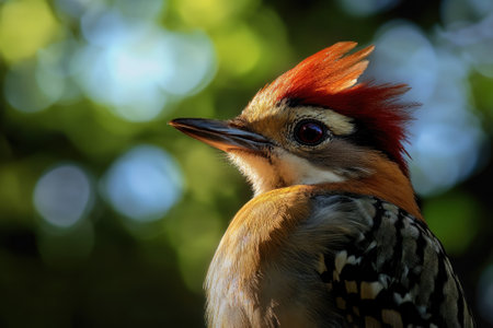 A striking woodpecker with a bright red crest and intricate black and yellow plumage rests on the rough bark of a tree. The birds sharp beak and intense gaze suggest alertness as it surveys its surroundings. Sunlight filters through the leaves casting a warm glow on the creature highlighting its unique markings