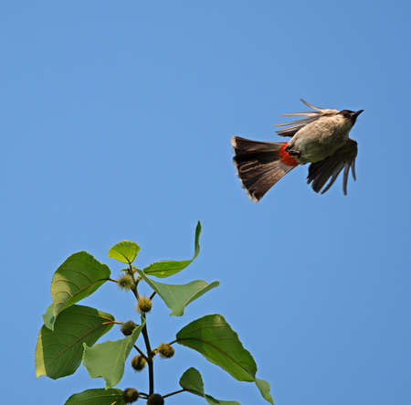 A yellow - vented bulbul is flying into the air to catch something.