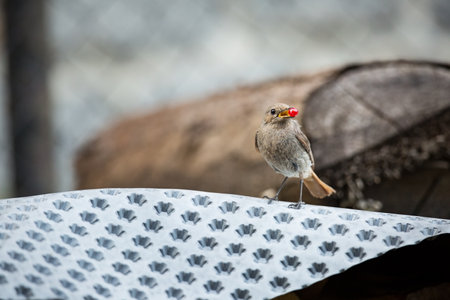Black redstart female bird with insect in her beak (Phoenicurus ochruros)