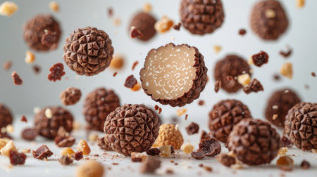 A visually enticing image of cut and whole chocolate truffles falling on a white background, evoking a sense of indulgence and luxury.