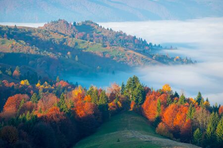 Amazing autumn morning in the Carpathian mountains. Colorful hills at sunlit and the fog sits below