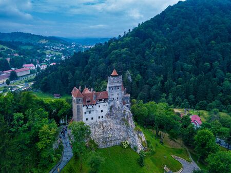 Aerial panorama view of the medieval Bran Castle, known for the myth of Dracula