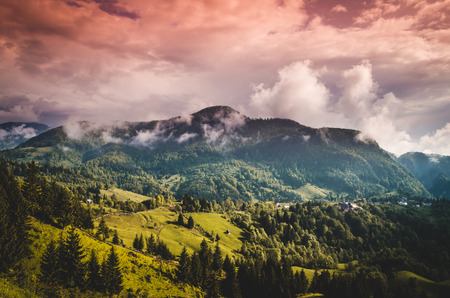 Landscape with old wooden houses and mountains covered by clouds. Mountains and clouds in the rainforest