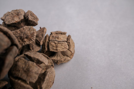 This image showcases rustic dried pods accompanied by natural spices and green leaves, beautifully arranged on a neutral surface, perfect for culinary or botanical themes.