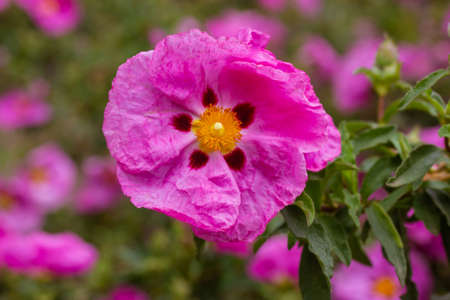 Bright pink rock-rose flower in a spring botanical garden. Cistus creticus is a species of shrubby plant in the family Cistaceae. A species of shrubby plant widespread in the Eastern Mediterranean.