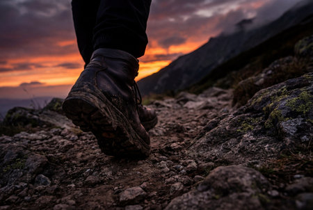 A close up view from ground level shows the dirty leather hiking boots of a trekker walking along a rocky mountain path while the sun sets behind silhouette peaks creating a dramatic orange sky.