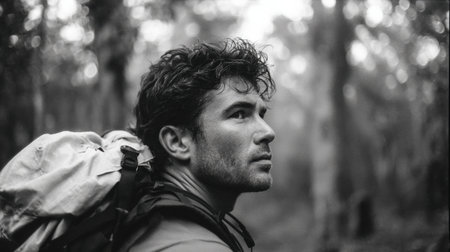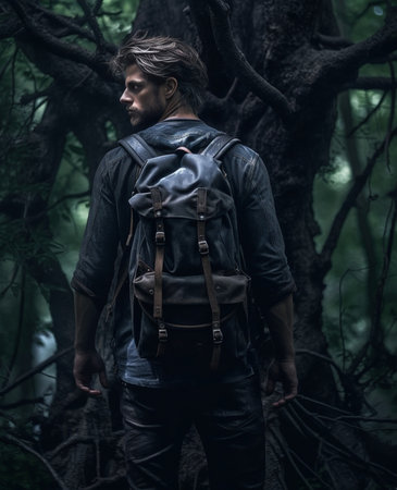 Generative AI : Male hiker standing in dark forest Man with backpack walking in mystery woodland Traveler in nature courage risk and success concept