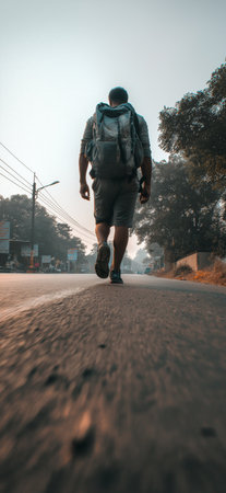 Backpacker walking on a road at sunset, motion blur suggesting movement and travel. Backpacker walking road at sunset journeying towards destination