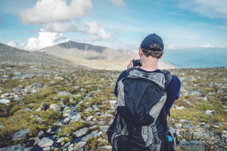 Girl hiker with backpack take a picture. Travel lifestyle concept.