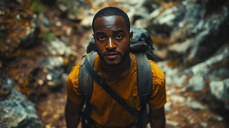 Portrait of a young african man looking at camera while hiking in the mountains