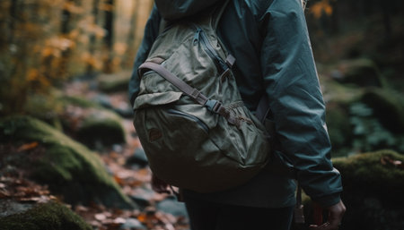 One person hiking in autumn forest with backpack and hiking pole generated by artificial intelligence