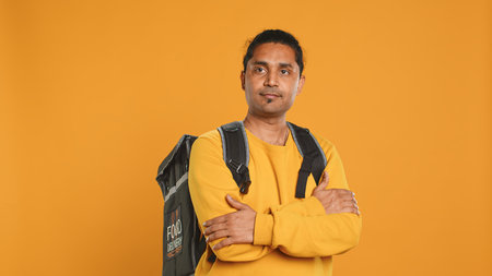 Portrait of man holding thermal backpack, crossing arms, ready to fulfill orders, studio backdrop. Calm food delivery service worker prepared to do delivery to customers, camera A