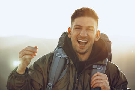 Happy young man hiker with backpack expressing joy and celebrating achievement