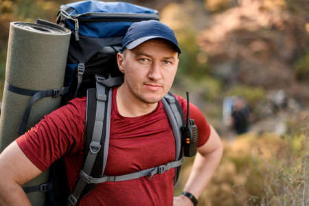 portrait of male tourist wearing cap and with hiking backpack