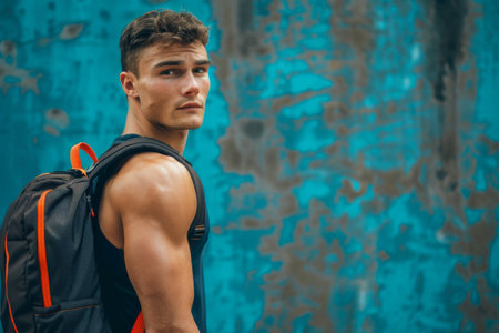 A man wearing a backpack is standing in front of a concrete wall. He appears to be looking at something off-camera while holding onto the straps of his backpack.