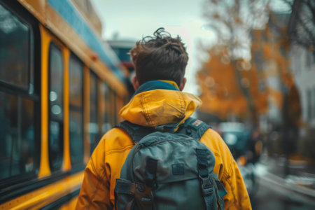 Traveler with red backpack in urban background.