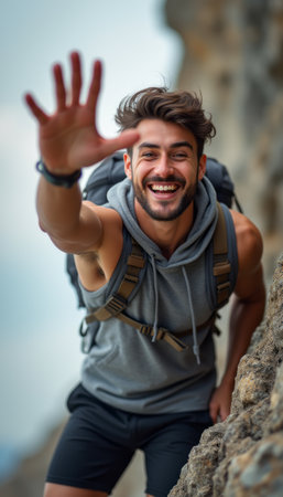 A cheerful young man with a stylish beard and tousled hair is climbing a rocky terrain, extending his hand towards the camera with a bright smile. His enthusiasm and adventurous spirit shine through as he embraces the thrill of the outdoors, showcasing the joy of exploration and connection with nature.