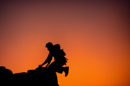 Silhouette of a man climbing on top of a mountain at sunset