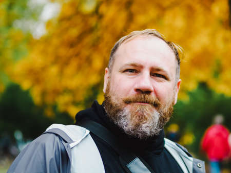 Adult Handsome bearded man outdoors portrait in autumn park. Candid portrait