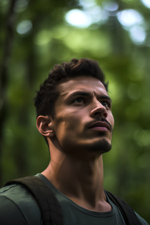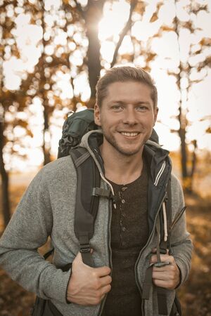 Portrait of a handsome young man with backpack in the forest.