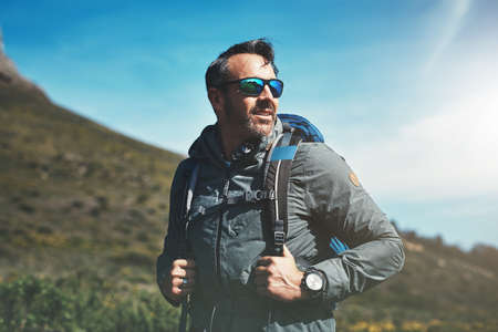 Always be proud of how far youve come. Shot of a middle aged man hiking in the mountains.