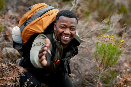 A helping hand. Cropped portrait of a handsome young male hiker offering you a helping hand up the mountain.