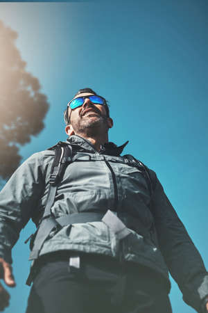 Portrait of a cheerful man in trekking clothes who is blinking