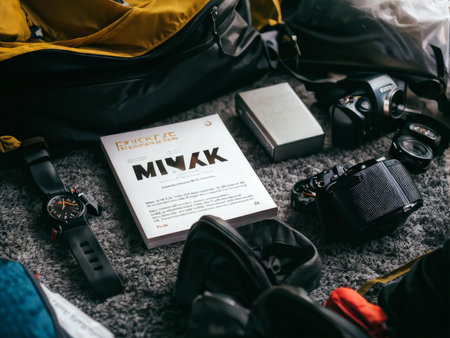 close up of a backpack with camera and on table