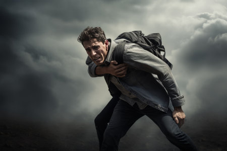 A man stands outdoors, looking ahead with a thoughtful expression. He wears a backpack and appears to be reflecting on something in the scenery.
