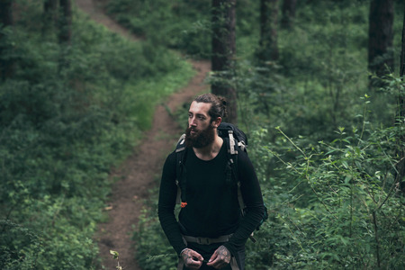 Hiker with backpack in forest walking along path