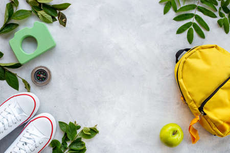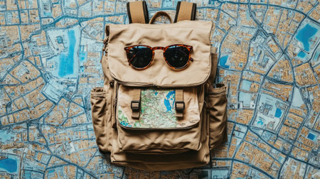 Hipster navy blue backpack and map,camera.traveler bag on background nature.copy space