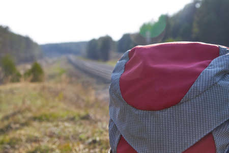Red backpack on the background of a railway and a pine forest. Travel concept